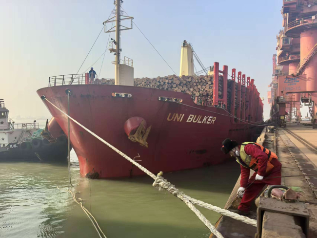 近日,廣州輕工集團輕出公司原木散貨船“優妮”號順利靠泊山東嵐橋港,標志著2025年度原木進口項目圓滿收官。截至2025年12月,輕出公司全年累計進口新西蘭輻射松原木13船、總貨量約50萬立方米,較去年翻倍,項目營收增長超70%,創下年度進口量歷史新高。